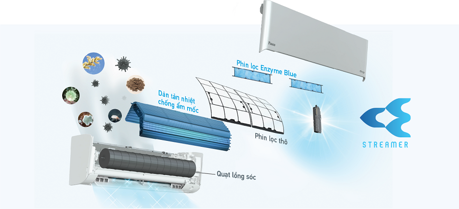 - Khử mùi hôi, nấm mốc, các chất gây dị ứng với phin lọc Enzyme Blue, công nghệ Streamer độc quyền và phin lọc bụi mịn PM2.5 (tùy chọn)
